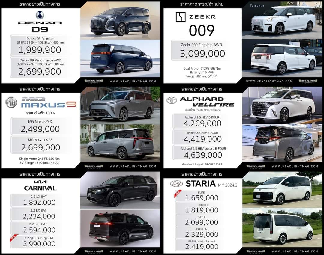 가격순(최고사양기준)으로 스타리아 < 덴자 D9 = MG 맥서스9 < 카니발 < 지커 009 < 도요타 알파드 순이다.