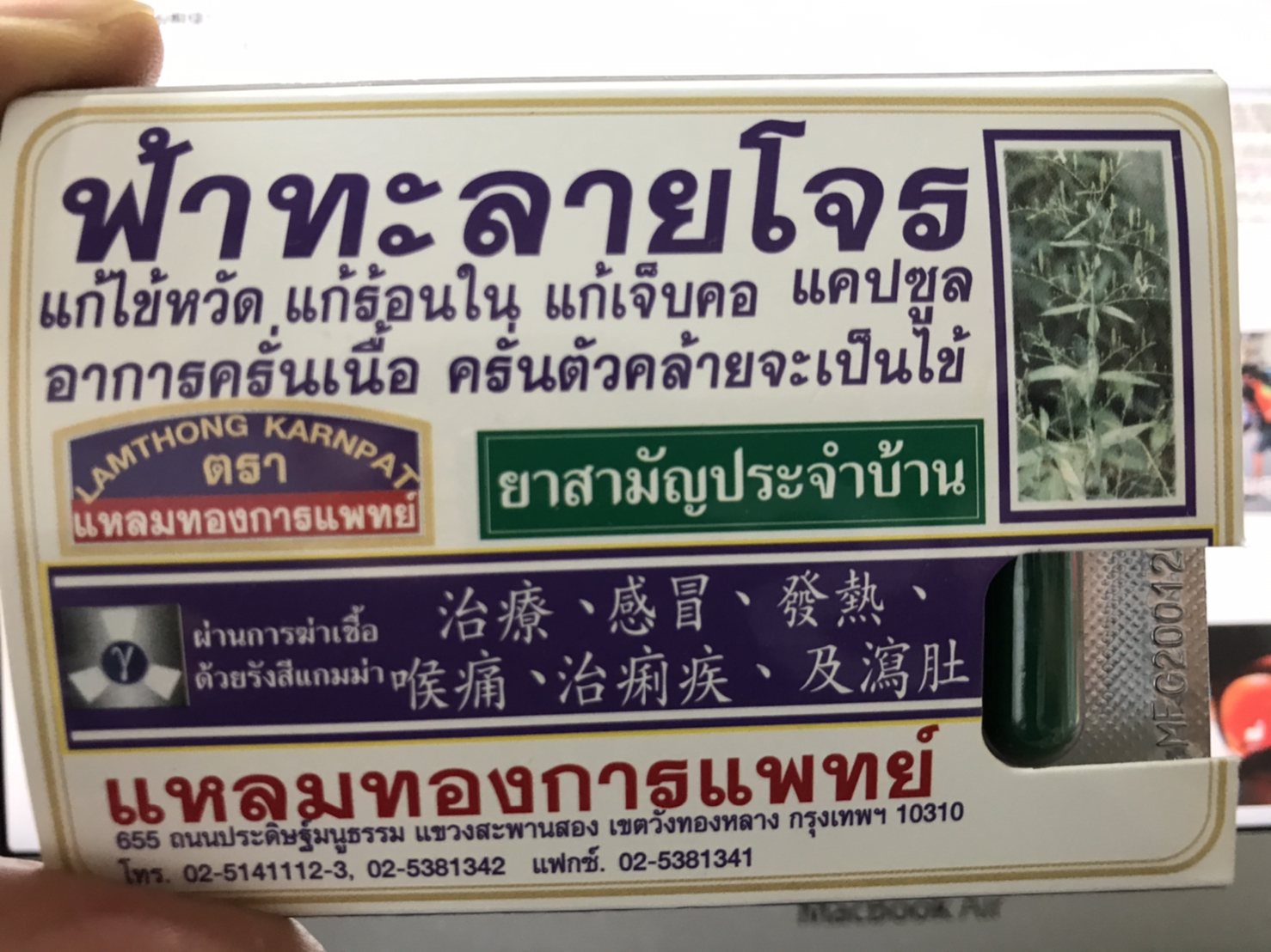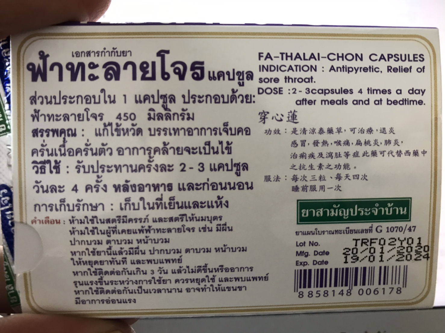 그래서 태국에서는 처방전 없이 살 수 있는 약으로 감기가 올 것 같을 때 먹거나 가벼운 감기가 있을 때 자주 먹는다. 다양한 제품이 있겠지만 편의점 (세븐 일레븐) 에서 저렴한 가격에 살 수 있어 상비약으로 태국인들에게 꾸준한 인기가 있었다. 코로나 19로 인해서 면역력을 높이기 위해 태국 천심련 캡슐이 도움된다는 의사들의 의견이 나오면서 편의점에 들어오면 순식간에 사라져 이제는 구하기 어려워 졌다.